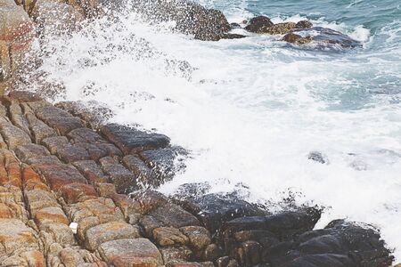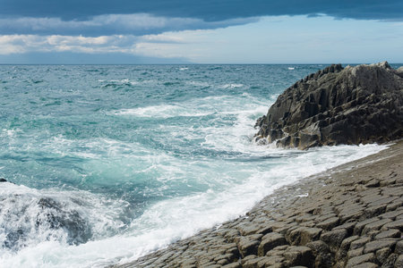 rocky seashore formed by columnar basalt against the surf, coastal landscape of the Kuril Islands