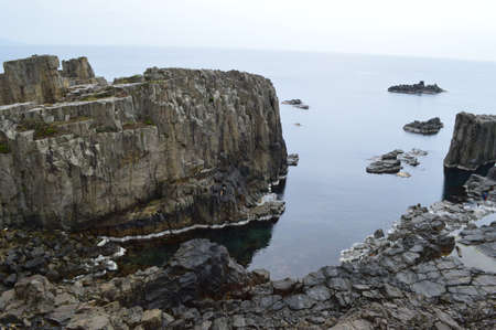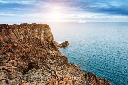 Rocks of Stolbchaty. landscape with columnar basalt lavas rocks forming a natural geometric pattern. Geographic cape on the east shore of Kunashir Island of Sakhalin Oblast, Russia. Mendeleyev volcano