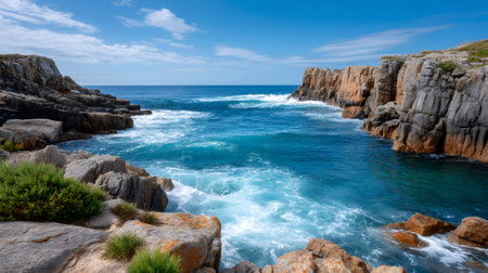 Ocean waves crashing between rugged rock cliffs under a clear blue sky, forming a natural cove