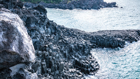 Volcanic Rock Shore at Jusangjeolli. Jeju Island, South Korea. The Jusangjeolli (columnar jointing) cliff is a spectacular volcanic rock formation at the southern coast of Jeju Island.
