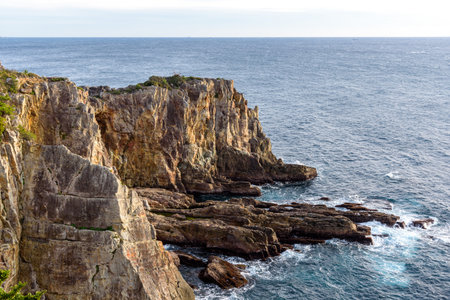 Landscape of Tojinbo Cliff, Mikuni cho, Sakai, Fukui Prefecture, Japan. Cliffs and sea.