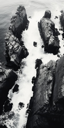 the black and white photo captures the mesmerizing waves crashing against the rocks in a realist detail style. the irregular structures of the rocks create a high-angle perspective, reminiscent of a national geographic photo. the image features columns and totems, adding an intriguing element. shot with a rollei prego 90, the photo showcases meditative color contrasts. ai generated