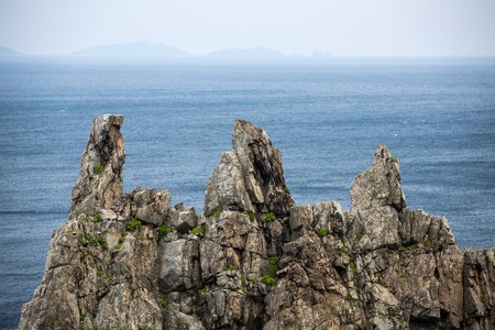 Trident-shaped rock on the background of the Japanese Sea and Islands
