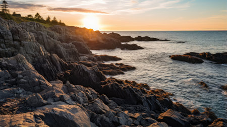 An AI generated illustration of a rocky cliff at sunset
