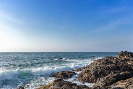 rocky sea shore in the afternoon. blue waves crashing the coast. fluffy clouds above the horizon.
