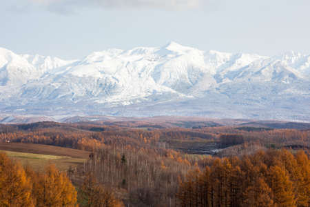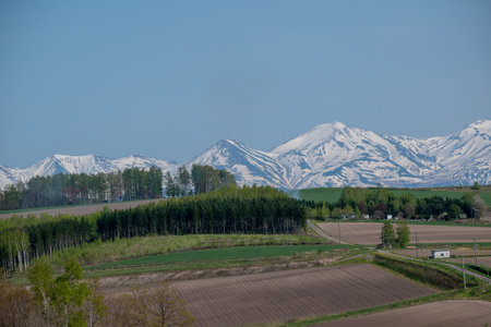 Early summer field farming area and mountain range covered with lingering snow, Tokachidake mountain range