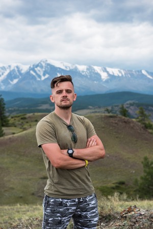 the guy stands against the background of snowy mountains with snow-capped peaks