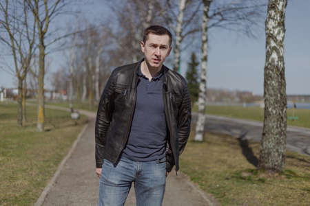 Young adult man in a black leather jacket and jeans walks along the path on a sunny day