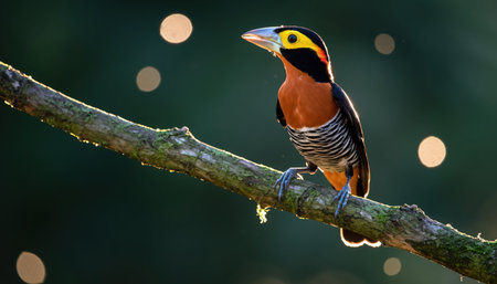 A close-up view of a vibrant and colorful bird perched delicately on a branch, showcasing its intricate feathers and bright plumage against the natural backdrop.