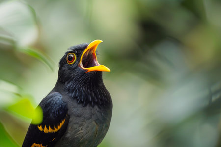 a portrait of a Hill Myna (Gracula religiosa), a bird known for its ability to mimic sounds. The Myna is perched, and its mouth is open as if it's vocalizing or calling