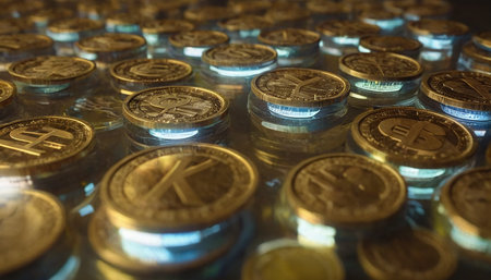Numerous coins with intricate designs glimmer under soft lighting, creating a captivating visual display. The coins reflect various hues, adding depth and interest to the arrangement on the surface..