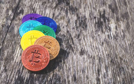 Bitcoin coins in rainbow colors on weathered wooden background with copy space. Multi colored handcrafted crypto currency. Seven different coins in red, orange, yellow, green, blue, violet.