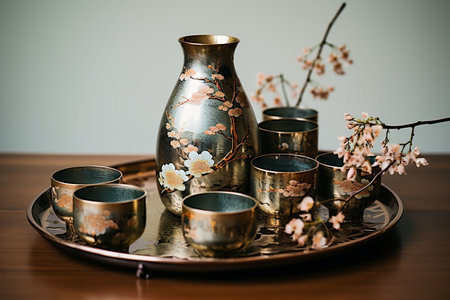 Vintage Sake Set on a Golden Tray generative by Ai.