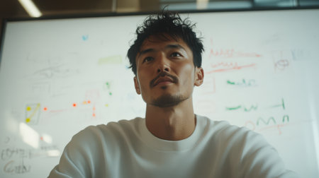 In the office boardroom, a young Japanese male entrepreneur wears a confident smile during a professional meeting, demonstrating his strategic acumen and ambition.