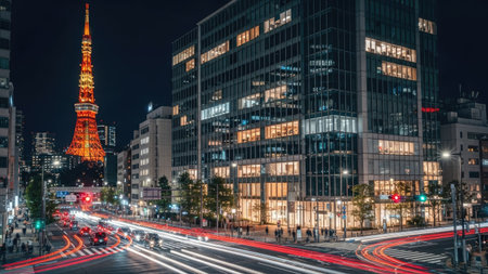 Futuristic city street at night with luminous car light trails for urban scene enthusiasts