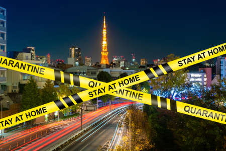 Tape quarantine on the background of an empty city. Empty road due to fever. Inscription quarantine on the background of the night city. Concept - ban on moving around city. Epidemic in Japan. Tokyo