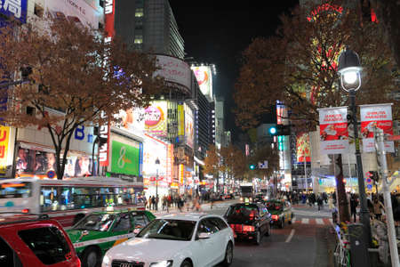 Tokyo, Japan - January 08, 2020: Tourists and Local People walking on the Beautiful Tokyo street among passing Cars in the Night time