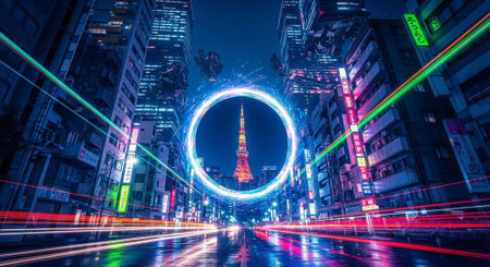Bustling urban scene in Tokyo with illuminated Tokyo Tower, neon signs, and light trails from vehicles.