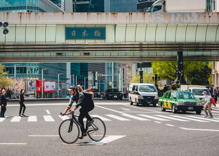 TOKYO, JAPAN - APR 18, 2019 : Nihonbashi Bridge Tokyo Business district City street with people cycling Tokyo Japan