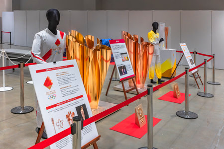 tokyo, japan - november 29 2021: Two cauldrons of the Tokyo 2020 Olympic and Paralympic Games used during tokyo 2020 olympic torch relay exhibited with the uniforms of runners at Tokyo Sports Square.
