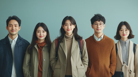 Happy korean students standing together in college yard portrait image, ai generated. Young Asian people in warm clothes picture photorealistic photography. Lifestyle concept photo realistic