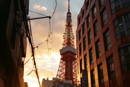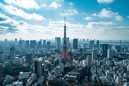 The Tokyo Tower stands tall against a pristine blue sky, showcasing its iconic presence in the vibrant cityscape of Japan's capital