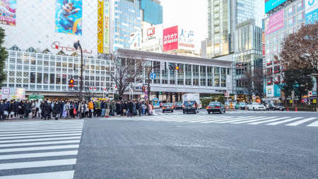TOKYO, JAPAN, JANUARY - 2019 - People crossing at famous crosswalk at shibuya district, tokyo, japan