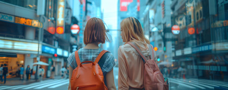 Exploring a new city together two girls urban navigate streets. Concept Travel, Friendship, Urban Exploration, City Streets, Female Friendship