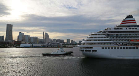 Japanese tugboats sailing in front of the Hinode pier on Tokyo port with the skyscrapers of Shiba district and the Tokyo Tower in the back under sunset sky.