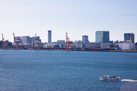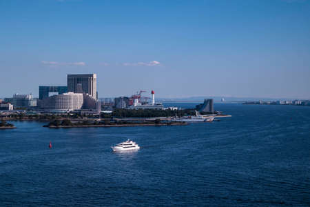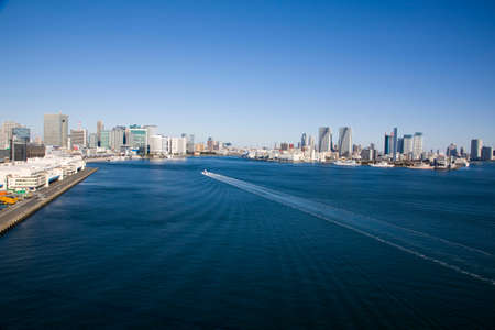 View of the Tokyo Bay during the day from the Rainbow Bridge in Odaiba. Busy waterway with ships. Landscape Orientation.