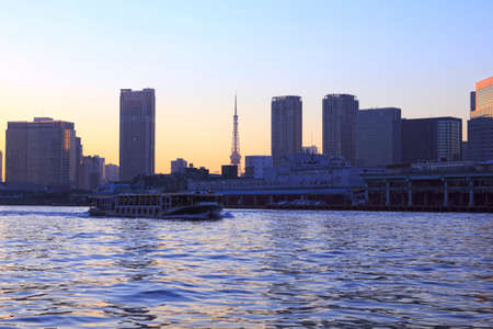 Tokyo skyline on the Sumida River at twilight.