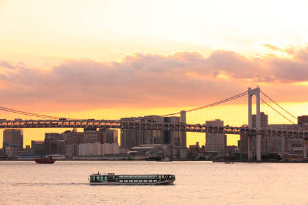 Japan. Tourist ferry on Odaiba Island. Motor ship on the background of the evening rainbow bridge in Tokyo. Water transport in Japan. Tourist ship in Tokyo Bay. Japanese rivers. Odaiba Tourism