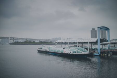 Asakusa, Japan - April 23, 2018: Tokyo Cruise Ship (Hotaluna) parking at Odaiba pier in a cloudy day.