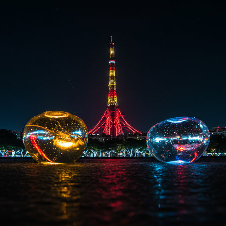 Tokyo Tower and reflection in the glass ball at night, Japan