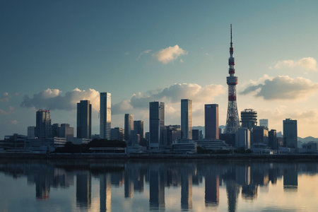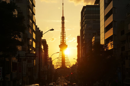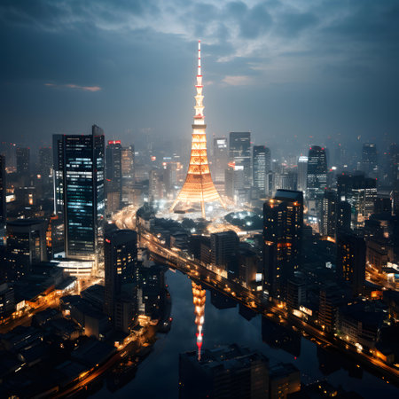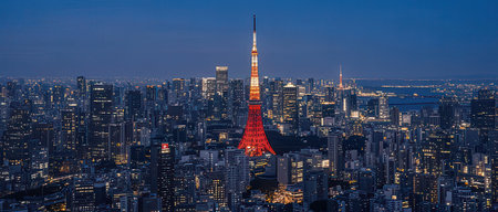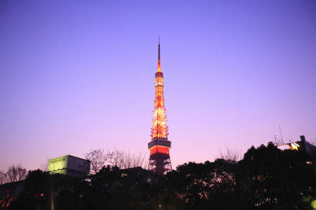 Tokyo Tower at Sunset Perspective View of Modern Architecture with Illuminated Lights, Tokyo, Japan