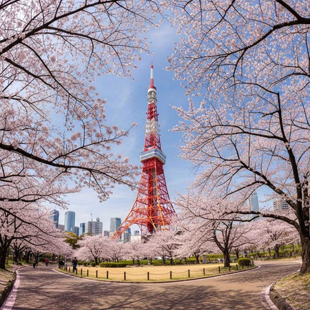 A serene Tokyo cityscape with cherry blossom trees and Tokyo Tower under a blue sky