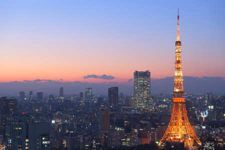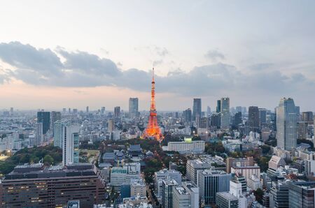 Tokyo Tower and urban skyline rooftop view at sunset, Japan.