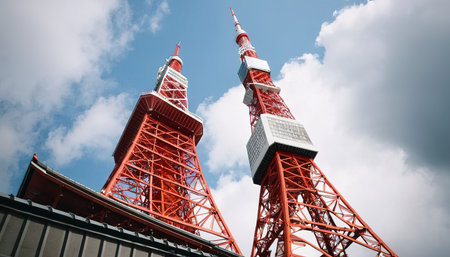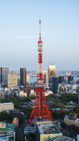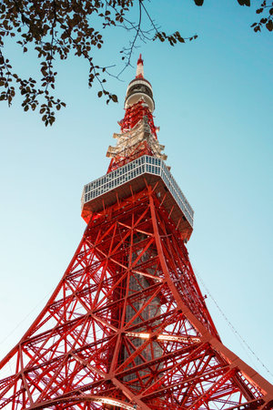 The Tokyo Tower stands tall against a pristine blue sky, showcasing its iconic presence in the vibrant cityscape of Japan's capital