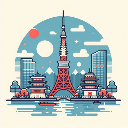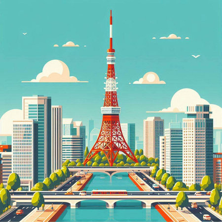 Tokyo tower in Tokyo, Japan. Vector illustration in flat style.