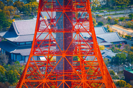 Tokyo Tower structure and temple. Shooting Location: Minato Ward, Tokyo