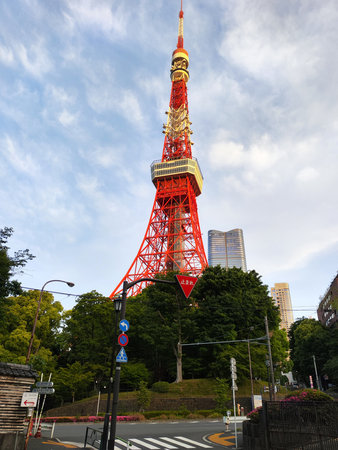 Tokyo, Japan- 11 May, 2024: The view of Tokyo Tower from the vicinity of Shiba Park. Japan. It is a communications and observation tower