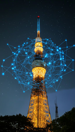 Tokyo Tower Connected Iconic Landmark Illuminates Night Sky in a Web of Blue Digital Network