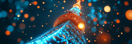 Abstract Tokyo Tower in Blue Network Dotted Outline on a Dark Background with Orange Highlights