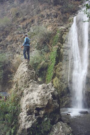 Traveler standing on a rock near waterfall in azad Kashmir, Pakistan
