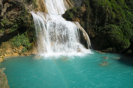 View to amazing waterfall with turquoise pool surrounded by green rocks and a faint rainbow