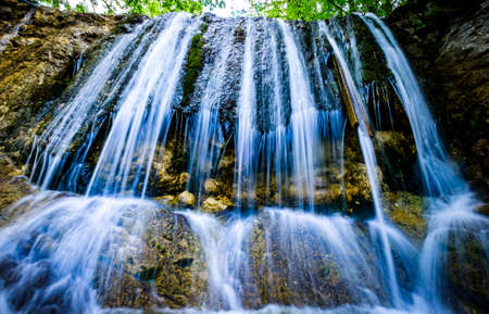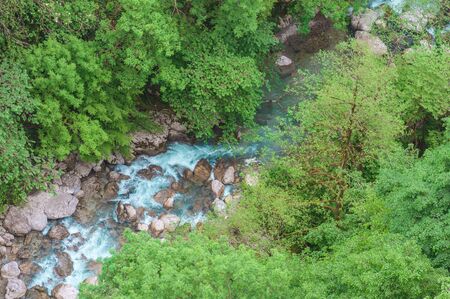 A scenic stream of a waterfall falling among a rocky gorge on the Agur river. Sheer cliffs among lush bushes and trees. Khosta microdistrict, Russia. Travelling, hiking and recreation in mountains.