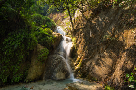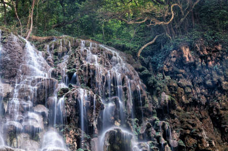 Erawan waterfall 7th floor with water flowing through natural stone in tropical rainforest at national park, Kanchanaburi, Thailand