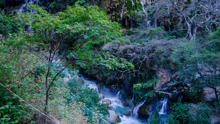 Jangle landscape with flowing turquoise water of Erawan cascade waterfall at deep tropical rain forest. National Park Kanchanaburi, Thailand