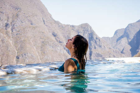 Beautiful woman in a blue swimsuit in the water in front of a huge mountains in a grotto in Tolantongo Mexico.