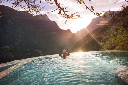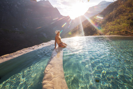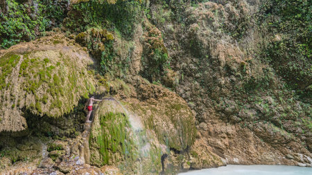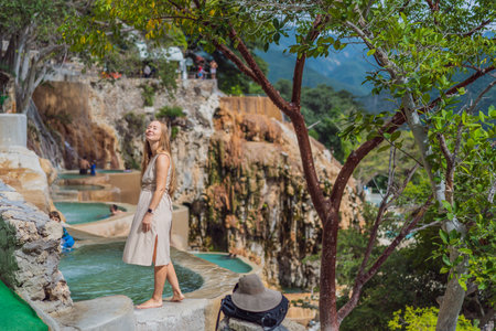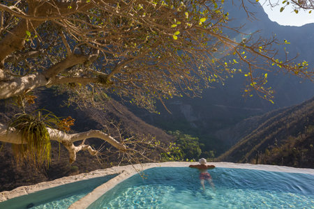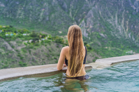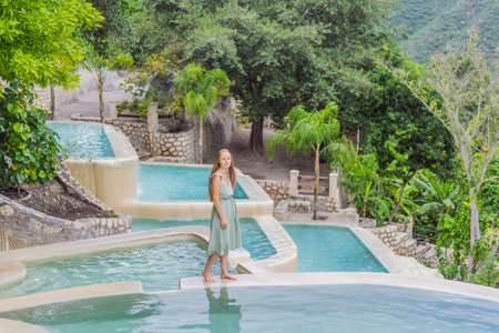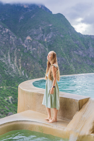 Female tourist at the hot springs of Grutas Tolantongo, Mexico. Adventure, relaxation, and natural wellness concept